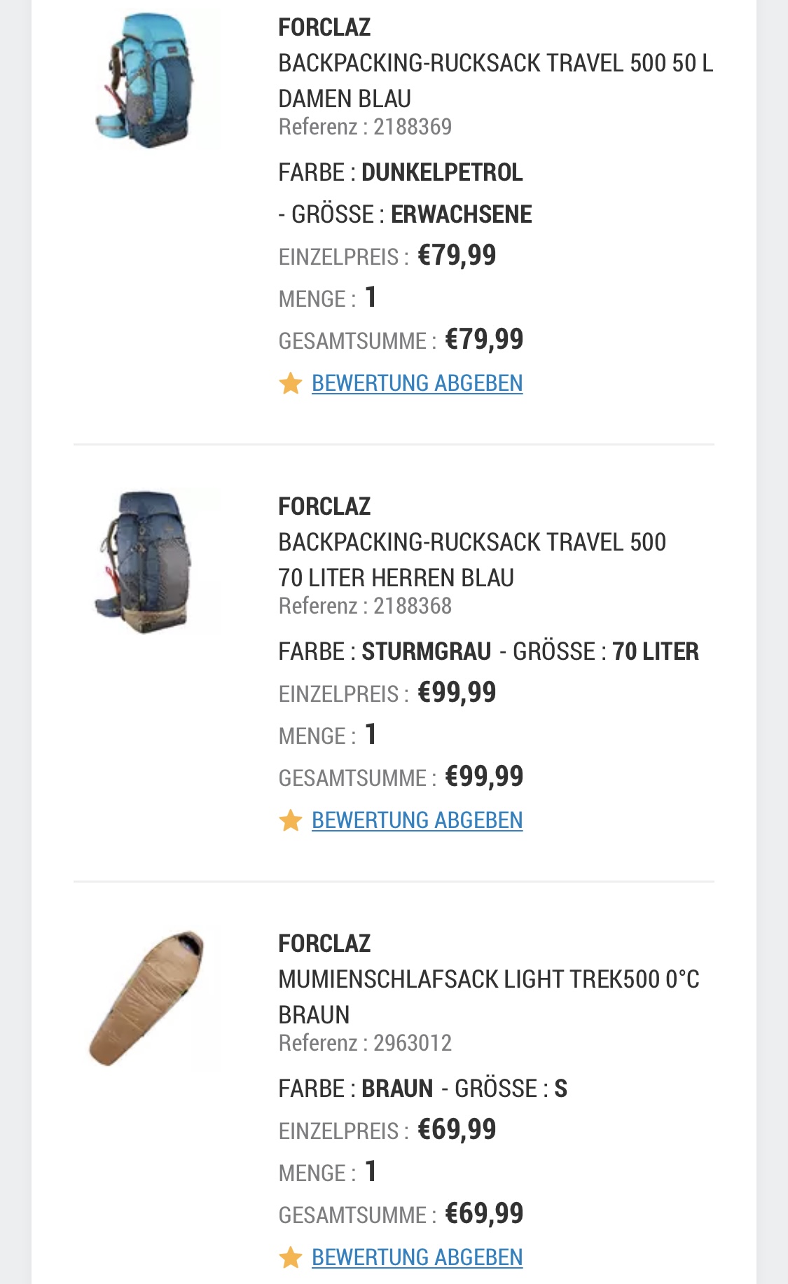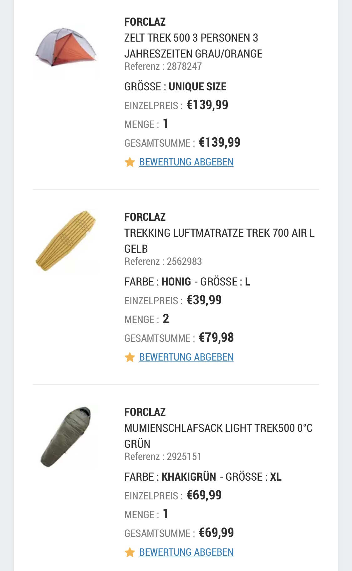 제일 중요한 백패킹용 가벼운 텐트와 침낭, 베낭, 그리고 침낭 밑에 깔 에어 매트리스도 구매를 했습니다. 한번 사용을 해봤는데 밑에서 냉기가 올라와서 폼으로 된 매트리스도 사야 할 것 같더라고요. 어쨌든 이렇게 총 600유로 살짝 안되는 599쩜 몇몇 유로입니다. 한국돈으로 80만원 정도가 되더라고요.