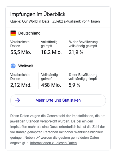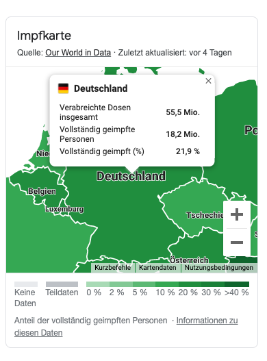독일은 벌써 21.9%의 시민이 2차까지 모두 접종을 완료했다고 하네요. 전세계로는 5.9%고, 한국은 현재 4.4%프로라고 하니 엄청 빠른 속도로 백신을 맞고 있는 것으로 보여져요.