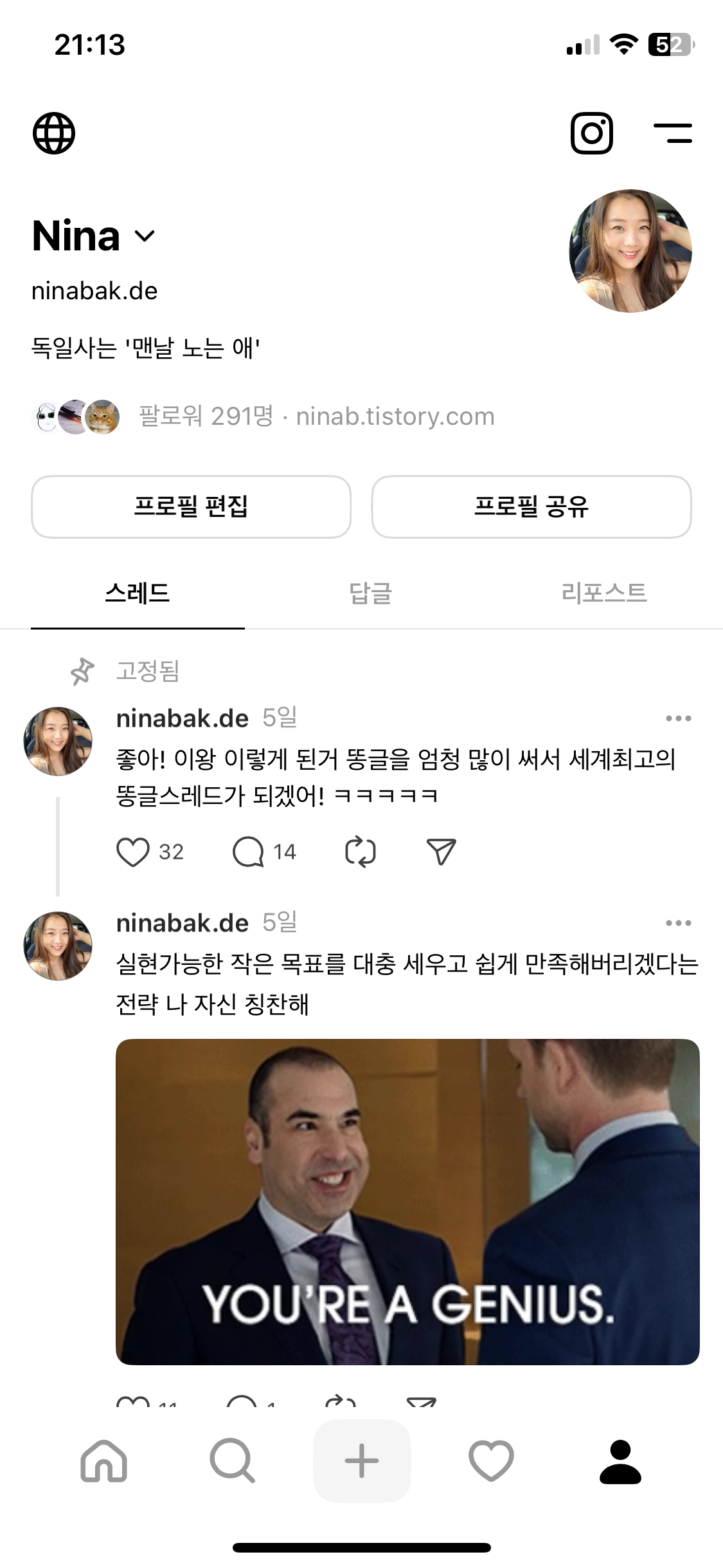안녕하세요! :) 지난주 금요일에 처음 스레드를 시작해서 일주일~열흘 정도 이런저런 글을 남겼었어요. 50명 정도에서 시작했는데 벌써 290명의 팔로워가 생겼습니다.
